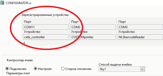 Чтоб проверить работоспособность ячейки, нужно воспользоваться программой cells_controller_tester по пути C:\ACL\ cells_controller_tester. Для начала нужно закрыть все открытые ячейки и узнать номер СОМ порта, к которому подсоединены платы ячеек. Для этого заходим в конфигуратор. В зарегистрированных устройствах находим устройство под названием cells_controller и смотрим, какой СОМ порт указан там: