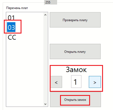 Теперь нужно выбрать плату, которая расположена в стойке с нерабочей ячейкой. В нашем случае это будет «03». И справа указать порядковый номер ячейки в стойке (нумерация начинается с верхней ячейки). В нашем случае это замок «1», что соответствует самой верхней ячейке. После этого нужно нажать кнопку «Открыть замок».