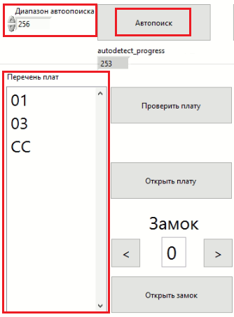 Затем в поле «Диапазон автопоиска» вводим значение 256 и нажимаем «Автопоиск». После окончания поиска в поле «Перечень плат» будут отображены адреса всех плат ячеек и плата сторожа, которая имеет адрес «СС»
